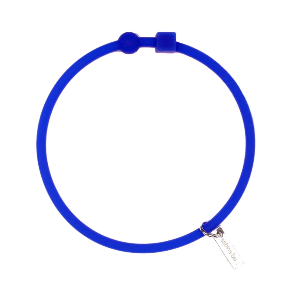 Bracelet fin en silicone avec une petite plaque métal logotée Sabine be.